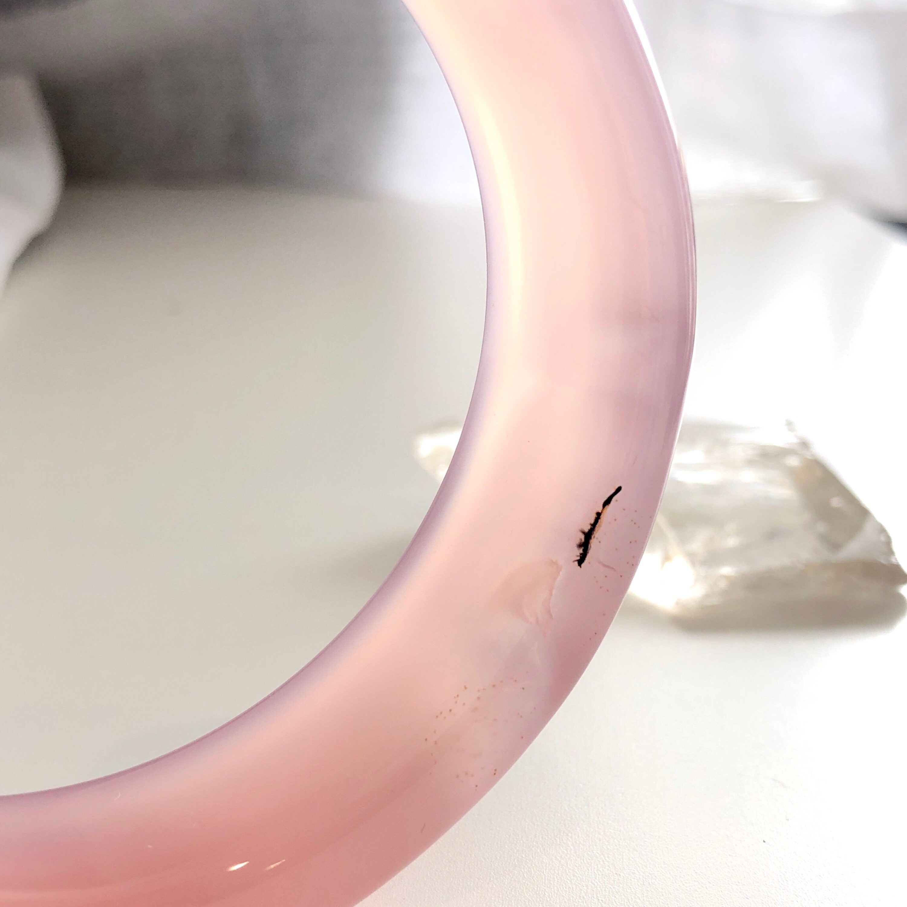 Beautiful pinkish purple Agate bangle. There is a dendrite formation on one side edge. It is hard to photography and I did my best to show you how beautiful it is. However, no matter how hard I try still couldn't show the full colour and patterns of this beautiful stone. You will be amazed by its beauty when holding it on your hands.