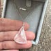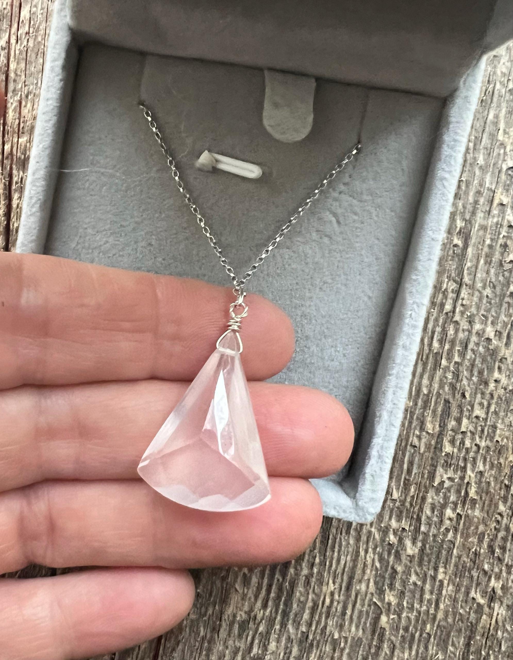 Beautiful faceted fancy cut Rose Quartz carefully wired in sterling silver and hung on a cable chain, finished with a spring clasp. The stone has soft pink and translucent, and in unusual shape.