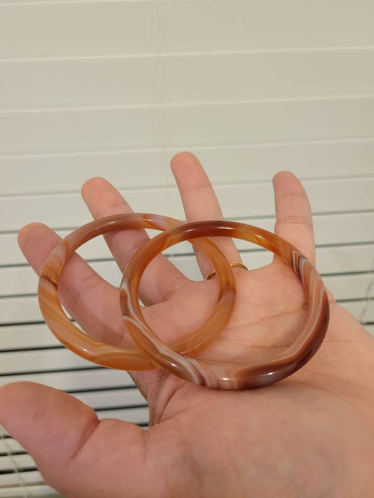 This listing is for Three (2) slim Agate bangles. I like to called Twinkle Bell bangle because they sounds like bell ringings when collide. These Agate bangles are hard to photography and I did my best to show you how beautiful they are. However, no matter how hard I try still couldn't show the full colour and patterns of this beautiful stone. You will be amazed by its beauty when holding it on your hands.