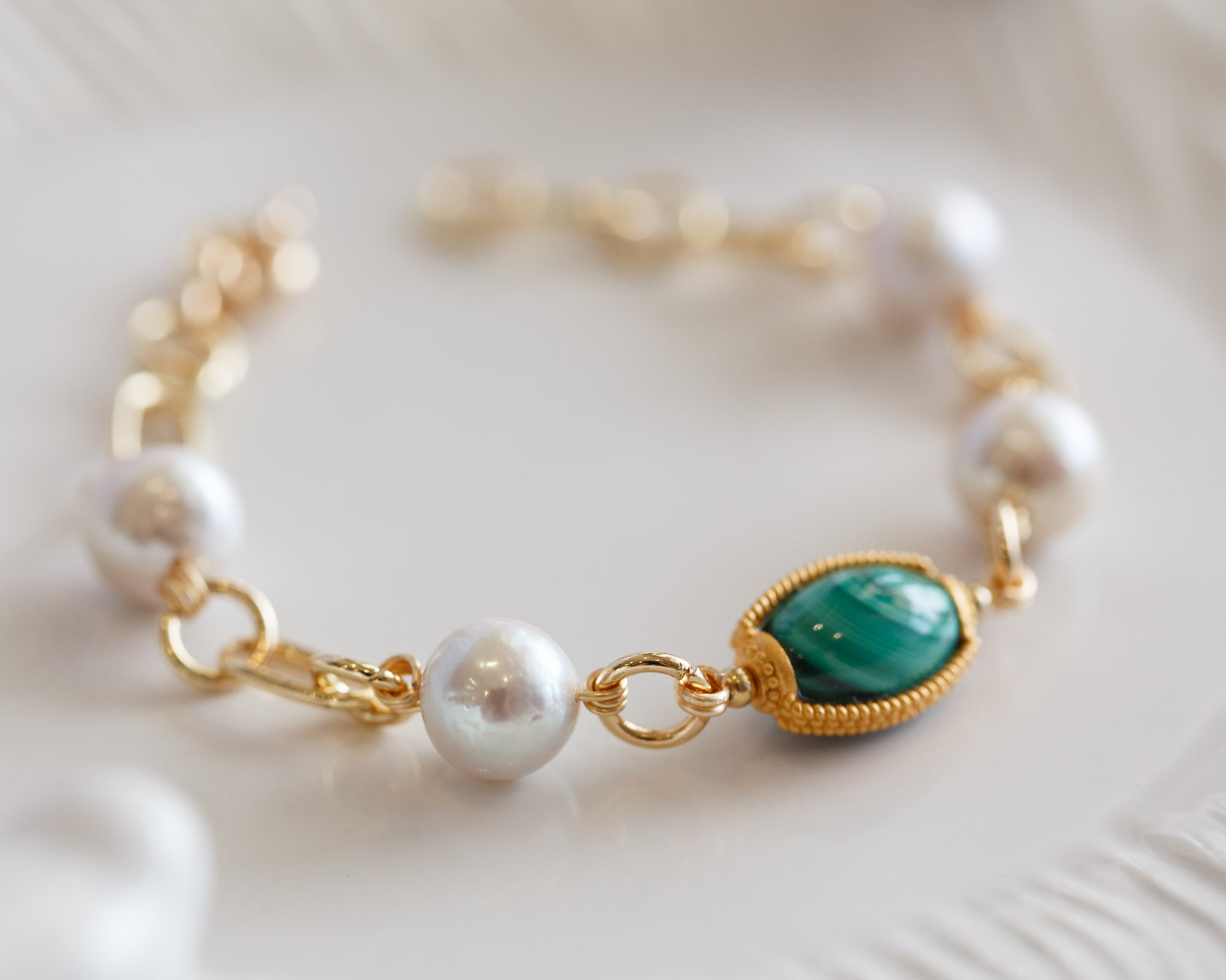 This opulent bracelet boasts four dazzling Edison Pearls with a circumference of approx. 9.5mm, resplendent in a heavenly white hue. The large-barrel Malachite is set in gold-plated sterling silver, drawing the eye with its exquisite green coloration and unique natural patterns. Artfully crafted from 14k gold-filled components, this elegant piece is understated yet mesmerizing - an alluring adornment for daily compositions or a special gift for that someone special.