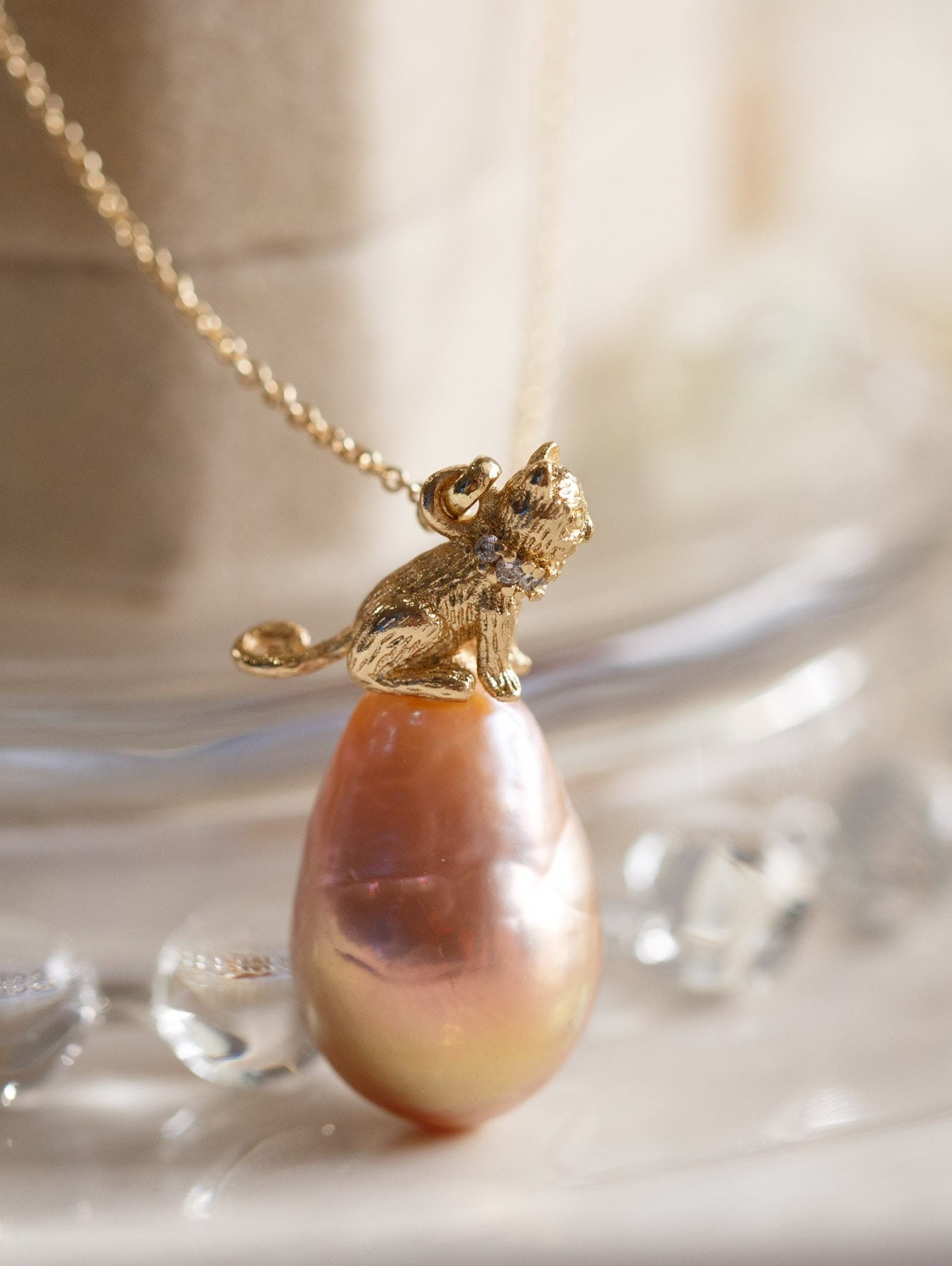 The Rylee Metallic Lustre Pearl Necklace is a beautiful and special piece. The pearl exudes an exquisite lustre and sheen, showcased perfectly in the reflective shadows captured in photos. This eye-catching piece showcases a metallic orange pearl finished with green undertones, delicately encased in a detailed cat-shaped bail and suspended from a delicate cable chain. Complete with a lobster clasp and extension, you will receive the exact necklace pictured. A captivating accessory for any outfit, this exquisite necklace would also look lovely stacked with other necklaces.